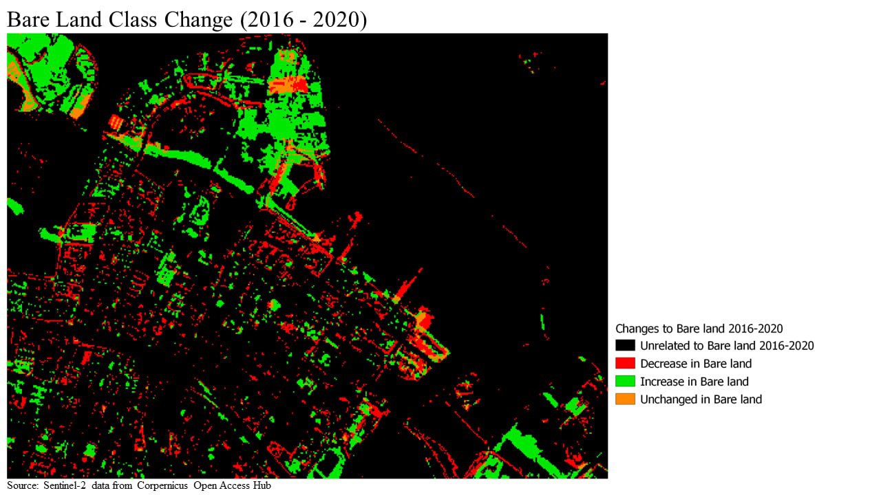 There was an increase by 45.71% of Bare land from 2016 to 2020 in proportion to the total area of Bare land in 2016.
