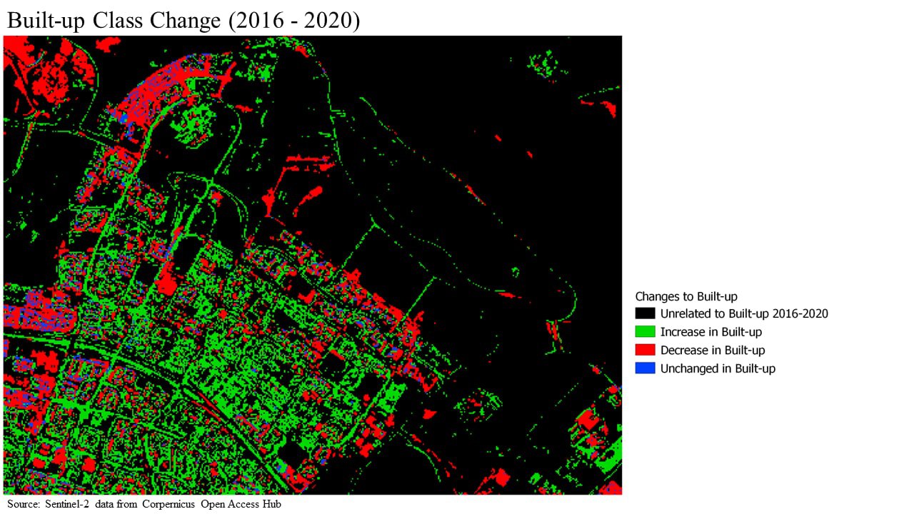 Punggol has seen many changes between 2016 and 2020. Surprisingly, the areas which have been classified to the same class in 2016 and 2020 does not exceed 85% across all classes (in relation to 2016 total area), with Water body at the highest proportion of 80.8% and Built-up at the lowest proportion of 13.4%. This indicates high changes to the land and this may be due to changes in land between 2016 and 2020, and inconsistent land area classification.