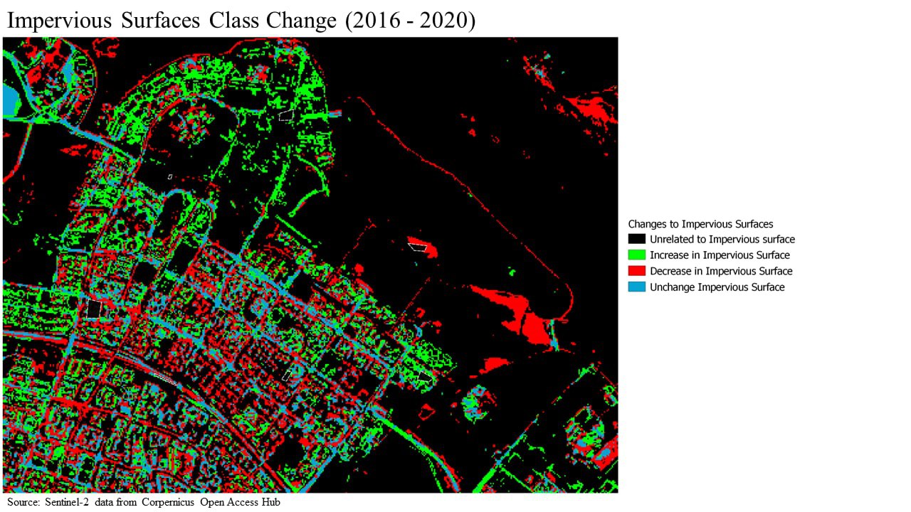 Lastly, the change in impervious surfaces from 2016 and 2020 is insignificant as the area of impervious surfaces constituted a very small amount of 2.40km2 in 2016 and 1.48km2 , making it difficult to observe the changes by looking at the map.