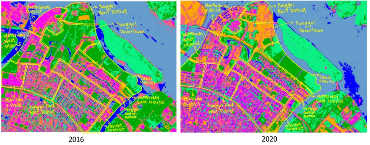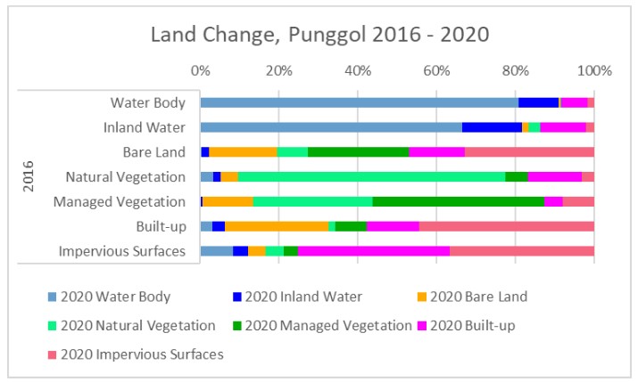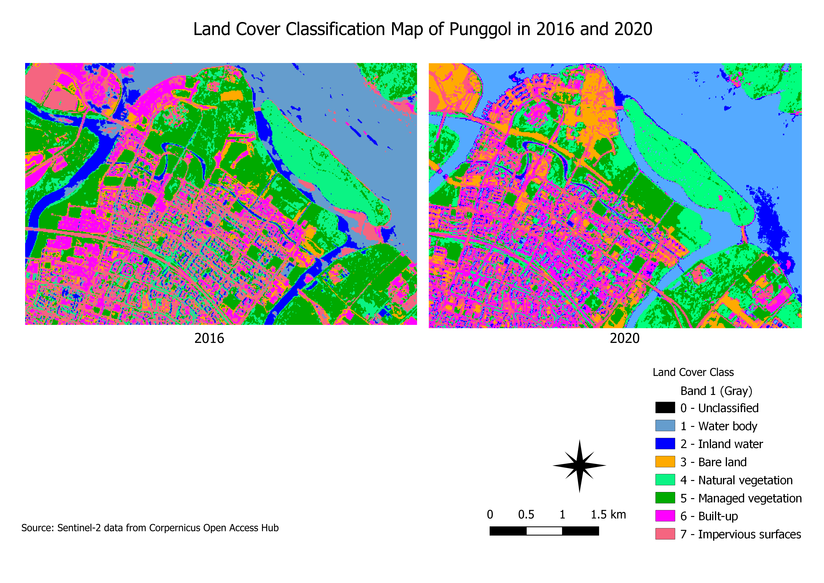 The results of the land cover classification of Punggol in 2016 and 2020 shows seven classes of land cover namely; water body, inland water, bare land, natural vegetation, managed vegetation, built-up and impervious surfaces.