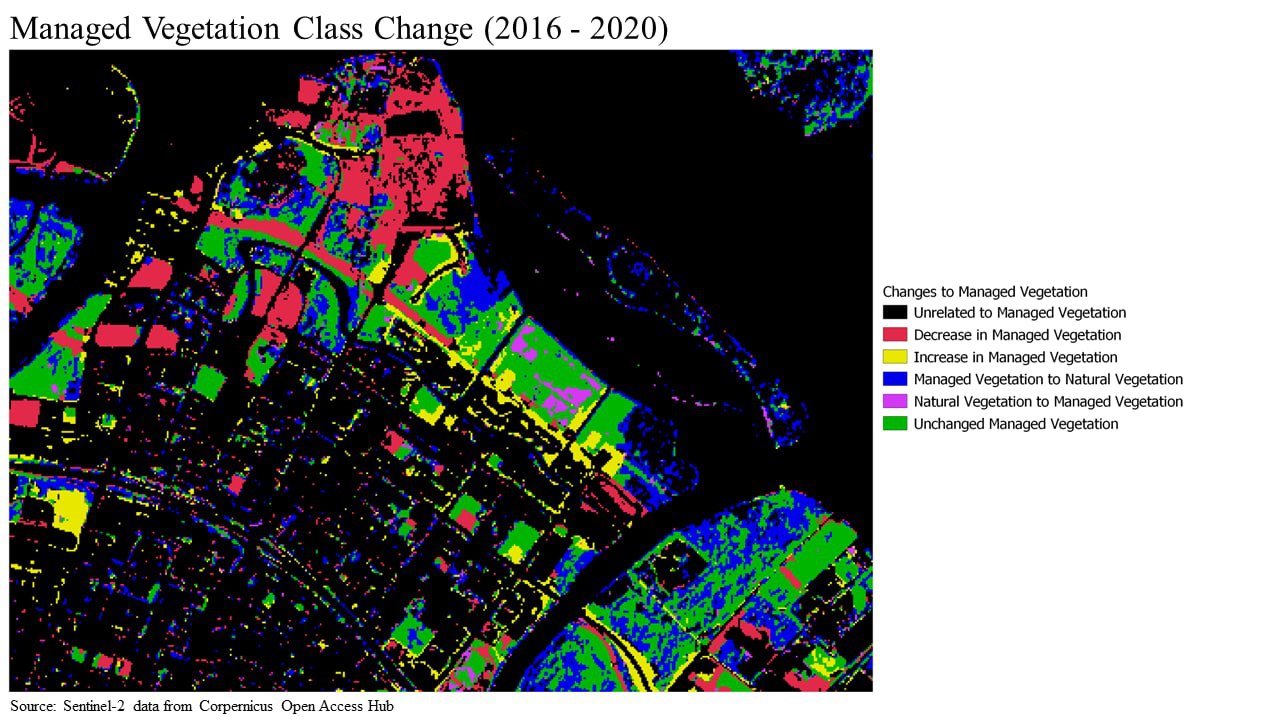 Since 2016, the Non-Managed Vegetation area has been converted to Managed Vegetation. 0.05% of Water body, negligible area of Inland Water, 6.13% of Bare land, 3.38% of Natural Vegetation, 3.41% of Built-up, and 2.73% of Impervious surfaces was converted into Managed Vegetation in proportion to the total area of Managed Vegetation in 2016.