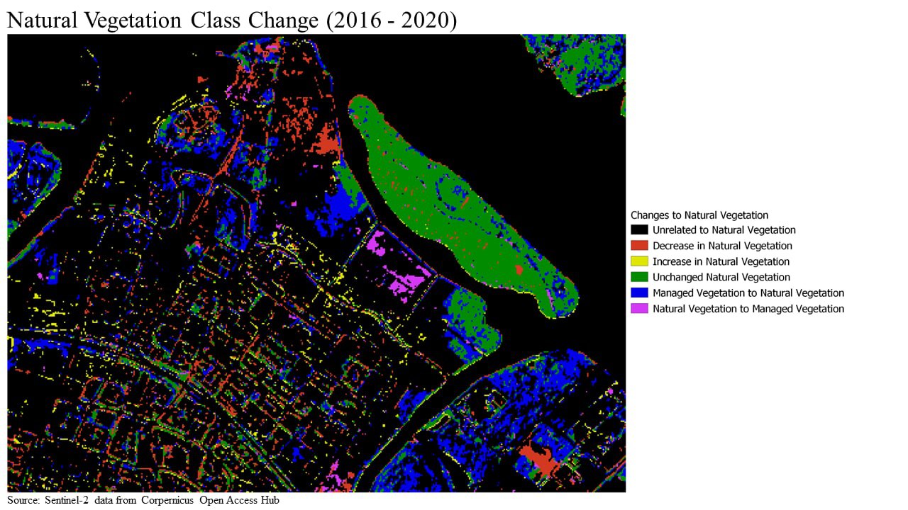 Since 2016, the Non-Natural Vegetation area has been converted to Natural Vegetation. 0.27% of Water body, 1.37% of Inland Water, 3.21% of Bare land, 51.17% of Managed Vegetation, 1.19% of Built-up, and 6.15% of Impervious surfaces was converted into Natural Vegetation in proportion to the total area of Natural Vegetation in 2016.