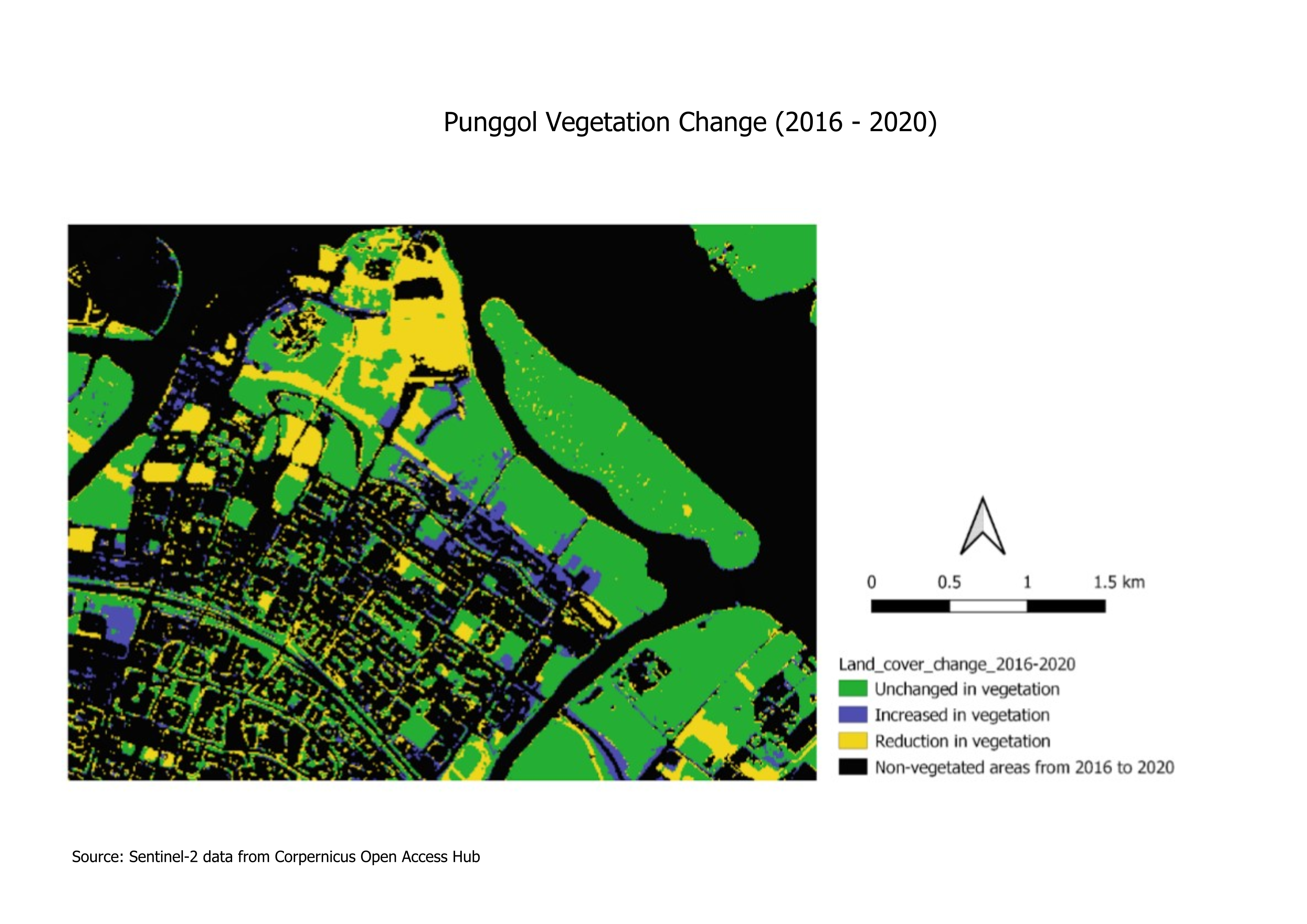 As for natural vegetation, there was a slight overall increase from 3.11km2 in 2016 to 3.47km2 in 2020, where areas at the Canal District were classified as natural vegetation in 2020. However, the increase in natural vegetation is negligible as compared to increase in other land cover classes.