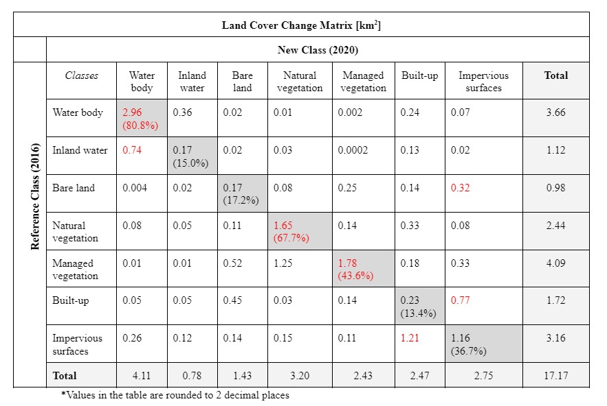 The land cover change detection matrix is shown in the table below. The diagonal numbers highlighted in grey indicate areas that did not change from 2016 to 2020 and the percentages are the proportion of the area to the total area in its respective class in 2016. The font of the largest type of area per class in 2016 is colored red.