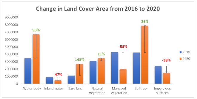 From 2016 to 2020, out of the seven classes identified, four of them saw an increase in area and they are Water body, Bare land, Natural vegetation and Built-up. In particular, Water body, Bare land and Built-up had a more-than-doubled increase in area of 93%, 143% and 86% respectively. The largest increase was for Bare land whose area increased from 1.11km2 to 2.70km2. On the other hand, land cover classes such as Inland water, Managed vegetation and Impervious surfaces all experienced a decrease, with Managed vegetation having the sharpest decline of 53%.