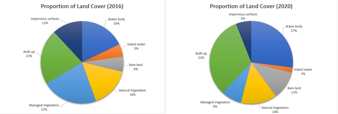 Looking at the proportion of land cover classes, Managed vegetation and Built-up were the dominant land cover class in 2016, both with a proportion of 22%, while the least classified was Inland water with a percentage of 5%. However, in 2020, the percentage of Managed vegetation dropped drastically to 8% while Built-up increased to 32% and constituted the largest proportion of area. Similar to 2016, Inland water had the lowest proportion of area (2%). Other than Built-up which increased in proportion, land covers such as Water body and Bare land increased to 27% and 11% respectively. However, despite the increase in area for Natural vegetation from 3.11km2 to 3.47km2 from 2016 to 2020, the proportion of the land cover decreased from 16% to 14%. This is because the rate of increase in other land cover classes such as Water body, Bare land and Built-up exceeded the rate of increase in area for Natural vegetation.