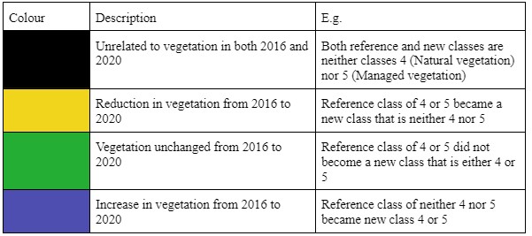 Lastly, once we have generated the land cover classification for 2016 and 2020, we performed the Land Cover Change Detection which overlays the two maps to identify changes in land cover. From the 49 cross classes identified, we changed the colours to represent changes in vegetation. Purple represents increased vegetation, Yellow represents reduced vegetation, Green represents unchanged vegetation and Black represents non-vegetated areas.